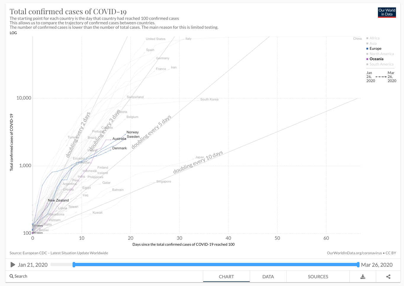 In regard to the running experiments, here’s that same our-world-in-data graph again for today, with NZ, Australia, Norway, Sweden and Denmark highlighted. I was asked to include Denmark into the mix because it is reasonably similar to Norway and Sweden in terms of demographics and society and because three data points are better than two (no prizes for guessing this was suggested by a scientist). On 18 March Denmark went into a lockdown situation similar to NZ’s (preceded by a partial lockdown on 13 March), although apparently people can still congregate in groups of up to 10. Norway’s lockdown started 12 March (though it isn’t as restrictive as NZ’s, either). Sweden is gradually implementing restrictions, though gathering size is still at 500 people, and are now suggesting that people work from home and that educational institutions close.