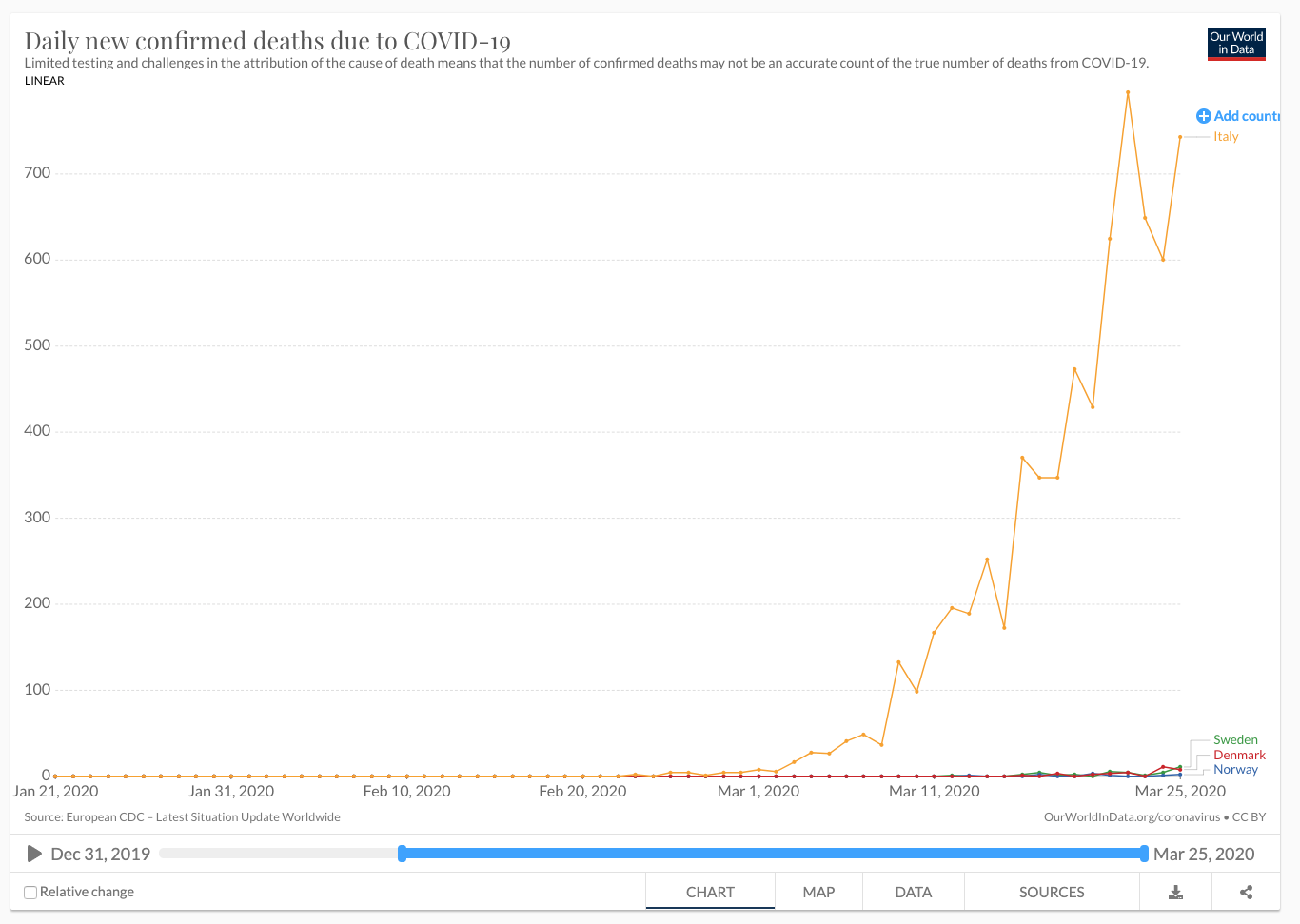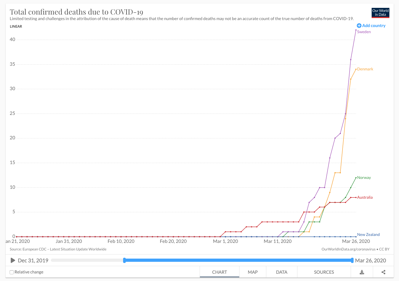 My problem with the data is, however, that when I read about who is being tested, I am starting to wonder how meaningful the confirmed case numbers are. Countries all have their own guidelines for who is eligible to be tested (you can hear the NZ Director General of Health getting grilled on this daily) and it is sounding like many people who are symptomatic are not eligible; in Sweden the Stockholm region is only testing at-risk people who are hospitalised and medical staff. How disappointing, the window into the experiment may already be closing. So let’s ‘pivot’ (trendy research word) to look at deaths instead. Death statistics can still be skewed because it depends what cause is attributed to the death, and how many people die will depend on the levels of medical facility available, but at least death stats are much clearer in terms of being countable, so should give us an idea of the comparability of country strategies for the time being.