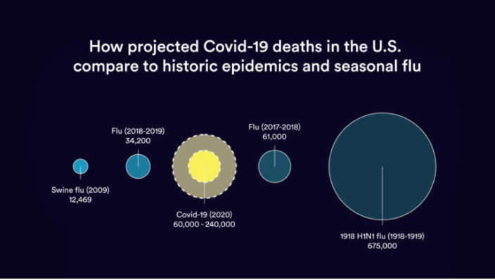 The graphic below for the US vividly illustrates the problem – click on the image to see website and see the accelerating rise of COVID-19 deaths in relation to projected (not actual) US death rates of other illnesses over March and April. The second graphic below shows the likely impact of COVID-19 vs other epidemics and seasonal flu in the USA relative to population. It makes COVID-19 look bad, though it is not in the league of the 1918 Spanish flu.