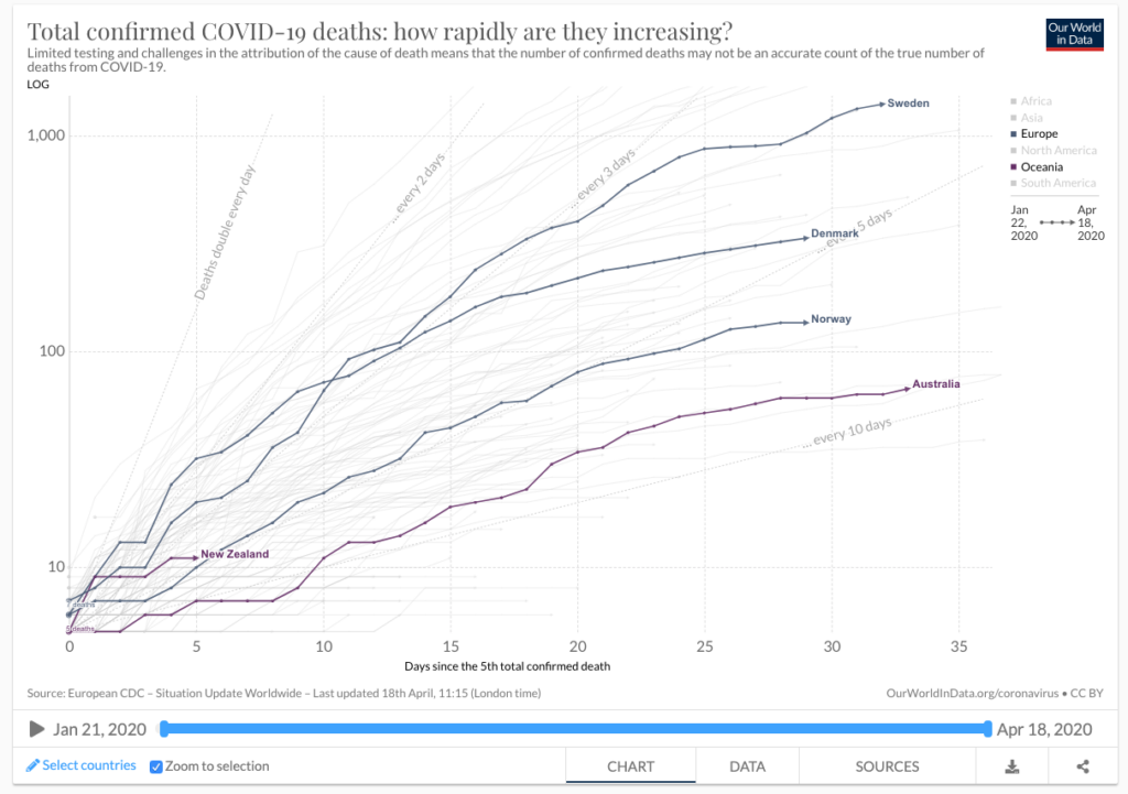 Out of interest, let’s check our experiment again, in regard to the other countries we compared with back at the two week mark. Everyone’s death rates are clearly flattening out, except for Sweden. They are still holding to their lack of lockdown, although 2 days ago their government passed legislation which will allow emergency control measures of people’s activities if the government deems necessary. It appears that Sweden’s cases are still growing at least the rate of doubling every 10 days, there will be more deaths to come. At present, Sweden still appears to be prepared and willing to take those losses for the gains that come from lack of lockdown.