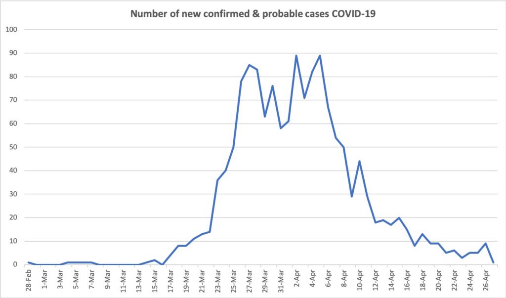 However, in those five weeks that spun past, so much has changed, our experiment has progressed and it has been a long meditative holding of collective breath. I decided today would be a good time to summarise a variety of aspects of the experiment from the outset. Here’s how our cases have trended – on 20th March we had 39 cases total, and the numbers of new cases were increasing daily. By 5 April we hit our peak, though we couldn’t know that till later.
