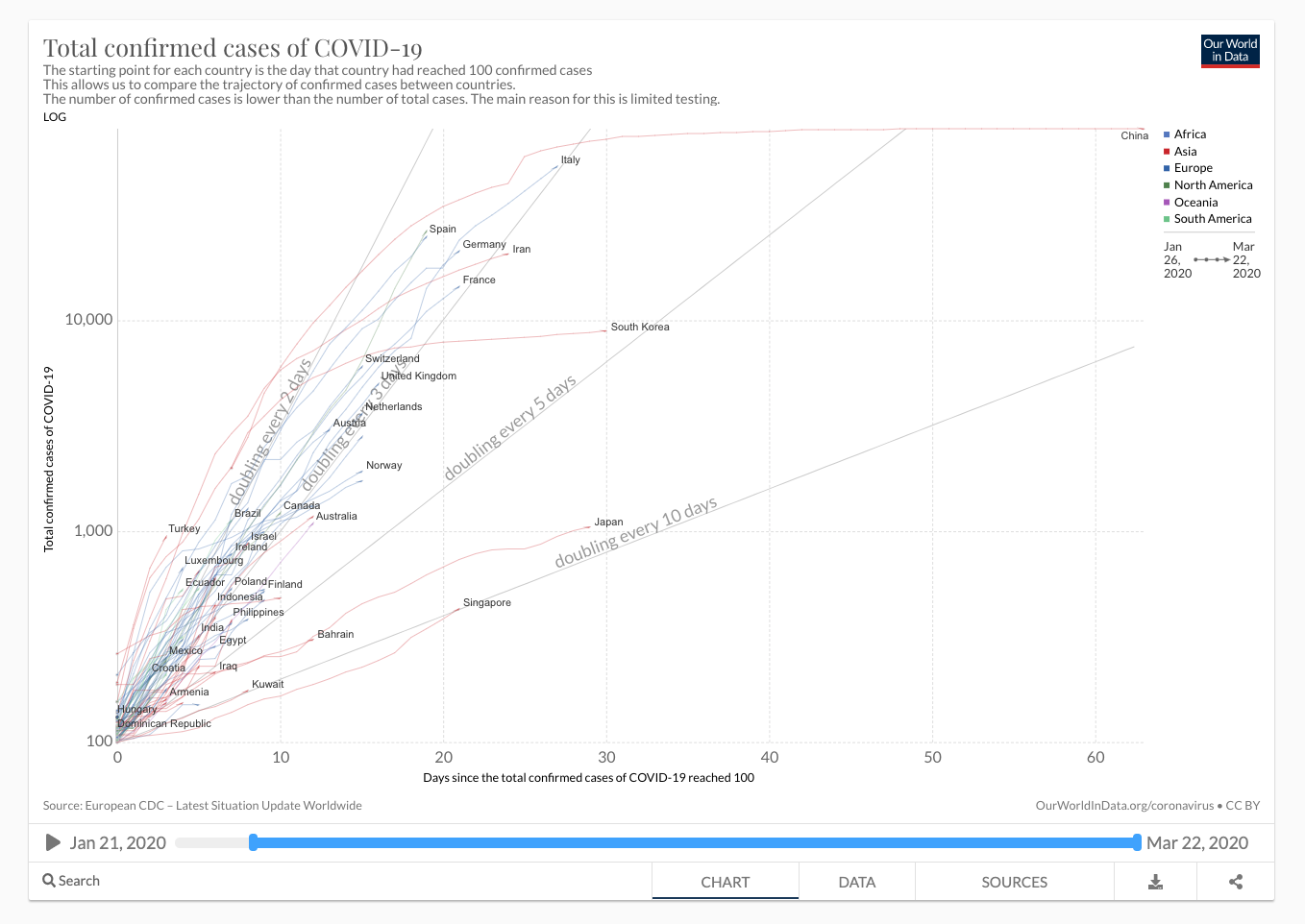 As we locked down, COVID-19 cases in the world looked like the picture below. Our interest was in the doubling rates of cases. We were yet to learn much of the jargon around infection rates, with lockdown goals being an R value of less than 1, which means that numbers of infections are decreasing as each person infects fewer than 1 other person. Early in 2020, the main focus was how fast will the numbers of cases double, and in Europe they were doubling around every 3 days. South Korea was the only country, apart from China, which had managed to halt its upward trajectory. We were no longer making jokes about China building hospitals in a week to deal with sick people in Wuhan.