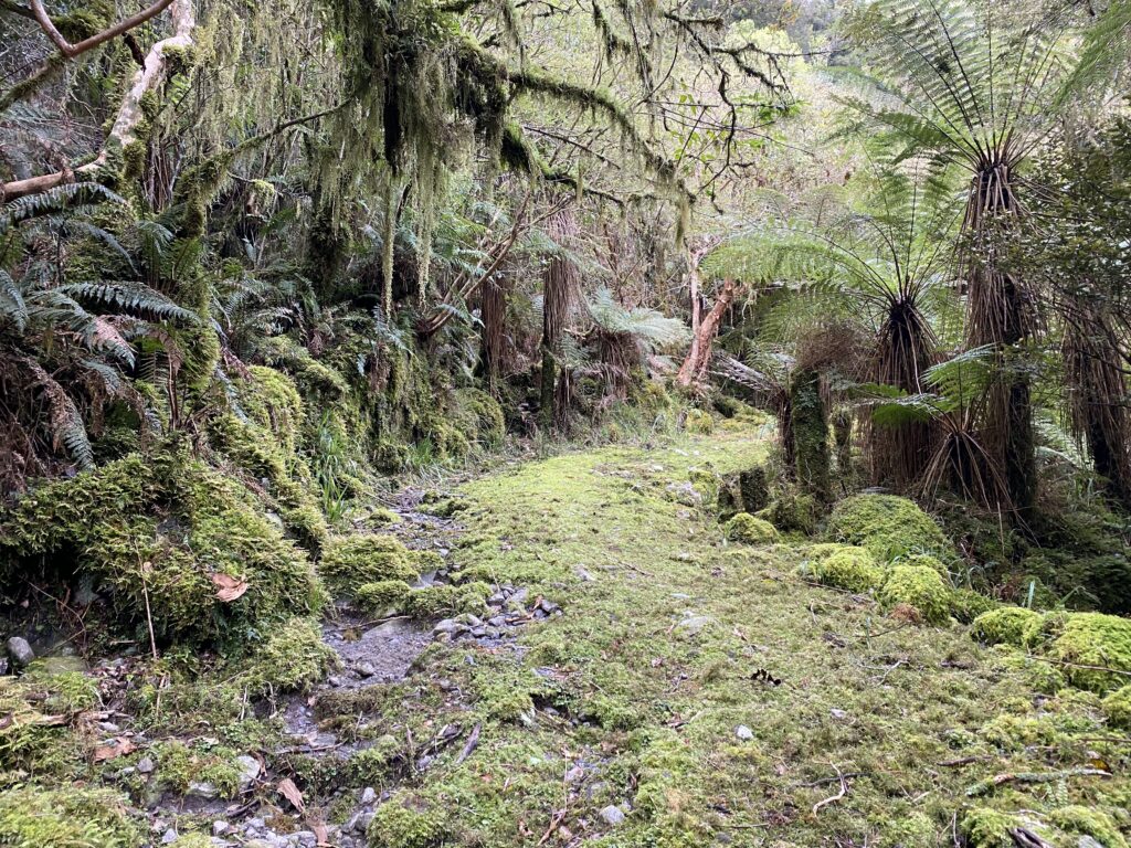 Going into the backcountry on your own provides immense freedom from everyday everything. The backcountry allows you to focus in on immediate needs – where to walk, what to eat, what to wear, where to sleep. Most other things rapidly become irrelevant. I could feel myself shedding circling negative thoughts as I walked in through the bush. The first part of the walk follows the Paringa Cattle Track which was the main route from Paringa to Haast until the road was completed in 1965 (my parents drove through with me as a baby in their first car, a Morris 1000). It was a pretty miserable job for the roadmen who maintained the track in the damp West Coast bush.
