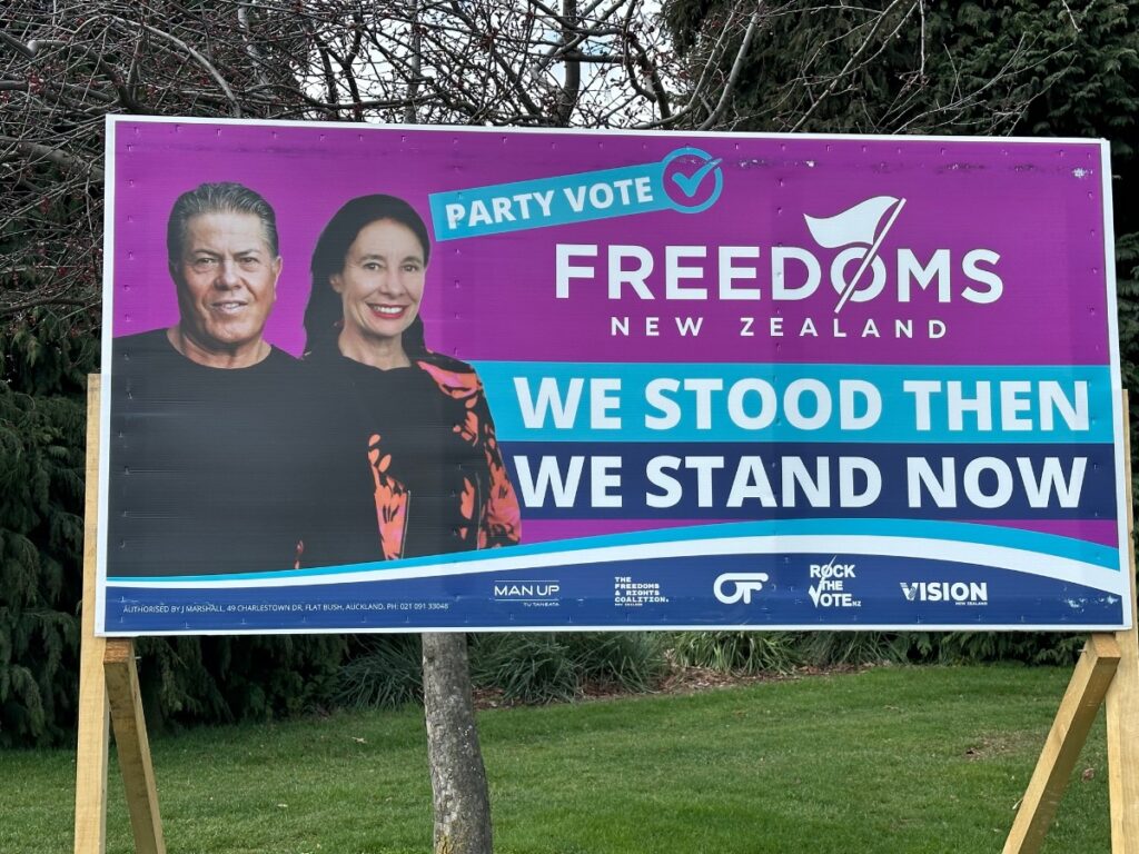 I should have been quicker off the mark in recognising the face of Freedoms New Zealand. I also got a bit confused by the number of names of entities on the posters – according to the website they consist of four entities which are ‘umbrella parties and affiliates’. I do wonder when ‘Then’ was and why their standing at that time was important. Freedoms NZ do get points for the most women depicted of any of the parties and the most Māori. Also for a raft of colours – four different colours between the two posters, although blue is a strong theme.