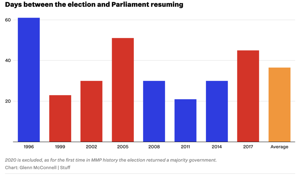 Back to the time taken to form a government, how long is reasonable? For a start, there hasn’t really been a month for negotiations, only two weeks. Until the final election results came in, it wasn’t clear whether National needed both ACT and NZ First, or only needed ACT to form a government. Three-way discussions are a very different thing to two-way discussions. It was probably a good thing that we had twelve years of MMP before we had a coalition of more than two parties (National + ACT, + United Future + Māori Party in 2008). I can also sympathise with National’s need to hold initial meetings between themselves and one other party at a time – the amount of horse trading required to juggle demands from two very different coalition partners must be a nightmare.