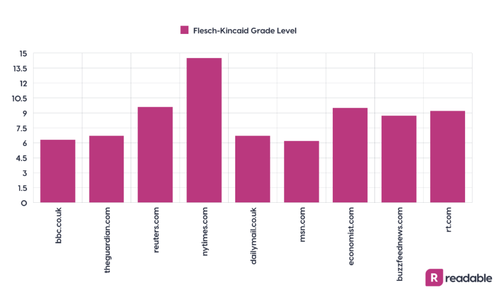 Reading levels for different news outlets – Grade 6-8 is ages 11-3, Grade 9-12 is ages 14-18