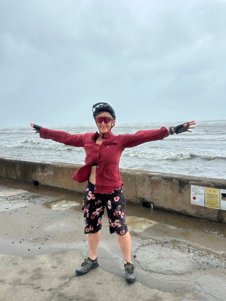 On Tuesday night and Wednesday morning we doomscrolled news reports and the Taiwanese weather forecasting website. Krathon was coming, but ever more slowly. It would hit later on Wednesday. We debated cycling for the first part of Wednesday but it seemed frivolous to cycle tour when the government had declared a typhoon holiday. However, there’s only so long you can sit around waiting for typhoons drinking coffee, or eating spring onion pancakes rolled up with egg, or deep fried mushrooms. So we headed 5km northwest to have a look at the coast, which was much more exciting, from a weather perspective, than Dajia town. The wind was entertainingly strong and there were weird sculptures to see.