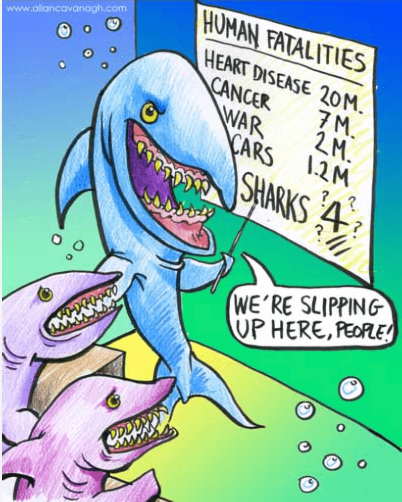 If we’re thinking about sustained killing campaigns, every year sharks kill around 10 humans and humans kill around 100 million sharks – that’s one every 3 seconds. About 24 people a year are killed by flying champagne corks, I mean, ‘die in champagne cork attacks’.