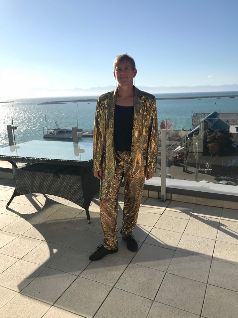 In contrast, our friend Tony has a wardrobe impressively laden with costumes. There was an occasion on which Chris borrowed Tony’s gorilla suit because there wasn’t a spare bed – the gorilla suit doubles as a sleeping bag. Tony’s costumes also include a safari suit with pith helmet, a Tongan suit with pictures of palm trees, beaches and cocktails, a hen suit, a horse suit for a couple (Tony went to a party with his girlfriend as the rear end of a horse – wonder why that didn’t last?). Tony also has a gold sequinned suit I borrowed for Chris’s Dad’s 89th birthday party. Too bad the gold sequinned suit isn’t natural materials or earthy.