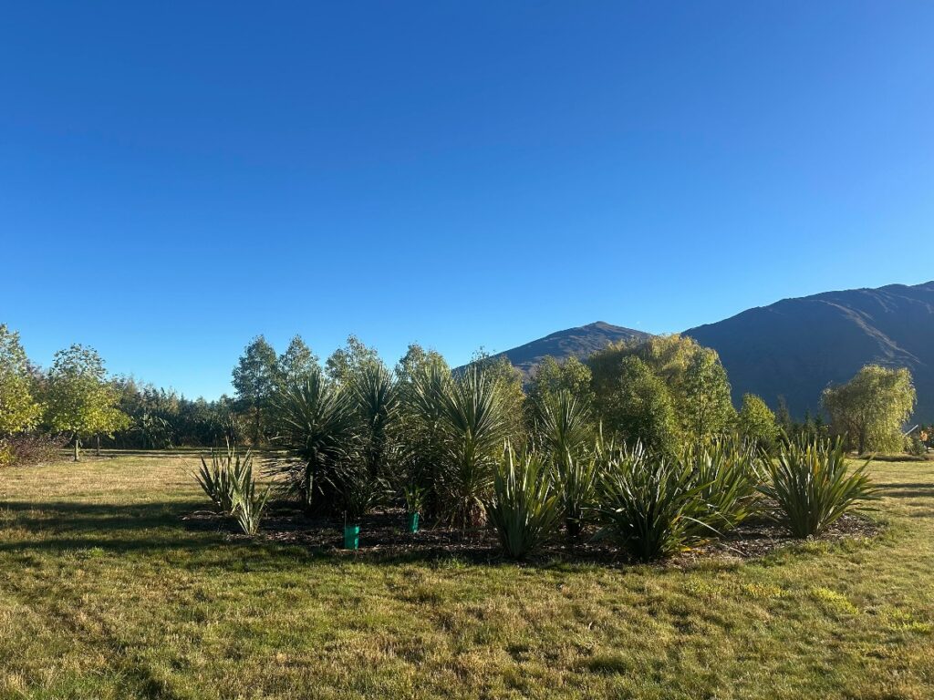 At pa harakeke, autumn is planting season. We add at least one new pod of trees – we plant densely in oval pods to minimise the care required when plants are young. The picture below shows a new pod and a 2 year old pod. Planting a pod makes it easy to can mulch the whole area – we discovered a thick layer of mulch speeds up plant growth like nothing else in dry Central Otago summers – and water young plants. I think the rapid plant growth in pods is more than the mulch and water, though. I like to think of plants holding hands – rather than lonely trees isolated by grass swards, our trees share resources and talk with one another (plants signal each other chemically). The exceptions are Lawsons Cypress which repel all boarders – the flax we have planted near Lawson Cypresses on our boundaries refuses to thrive.