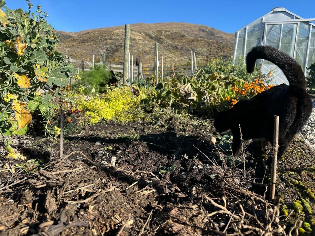 Luna helping in the vegetable garden. At the front of the picture is a patch of garlic covered with compost. Further back are pyrethrum and marigolds, which I’m using as attractive ground cover. My courgettes are keeling over after the first frost but aren’t yet quite dead enough to chop and drop