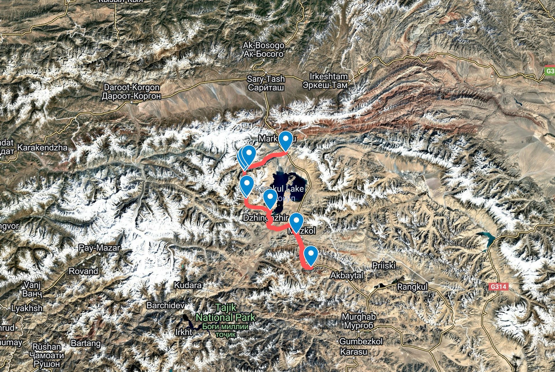 “I’m headed west of Lake Karakol. It looks like you can do this loop.” Michael points to two dashed lines on his Android phone screen which mark theoretical vehicle tracks through remote river valleys west of Lake Karakul, the next major landmark on the highway. There’s a significant gap in the dashes around a 4600m high point – Karachym Pass. This gap extends over the area labelled ‘Dankai’, a confluence of three major rivers with their origins in six-seven thousand metre glacier-covered peaks. The ‘standard’ route follows the highway to the east of Lake Karakul, passing through the town of Karakul, where we’d planned to replenish our food supplies.