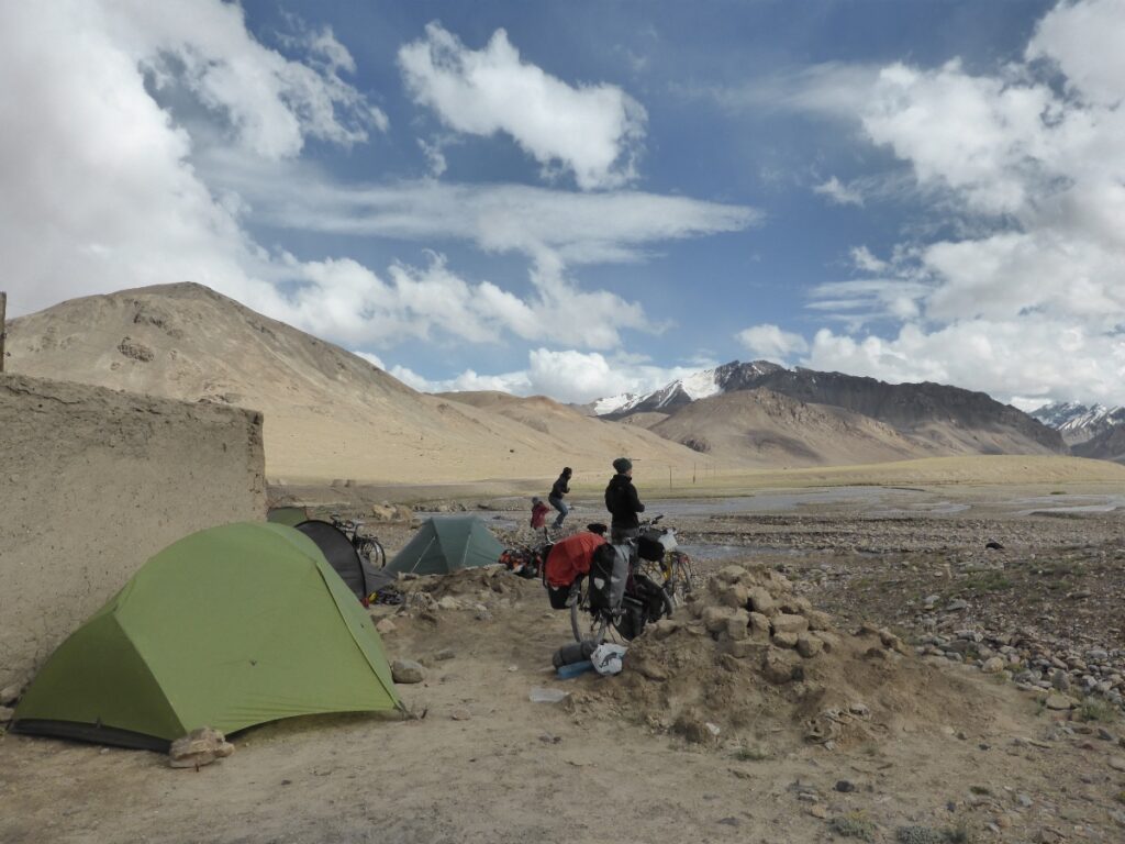 “This will do as a campsite,” I yell to Chris when I see a cluster of derelict mud-brick buildings, perched on a river terrace above a typical turgid, grey-brown Tajik river braid. We all search for sheltered campsites, peg down every guy line on our tents, and huddle around roaring cookers chatting about our next day of cycling.
