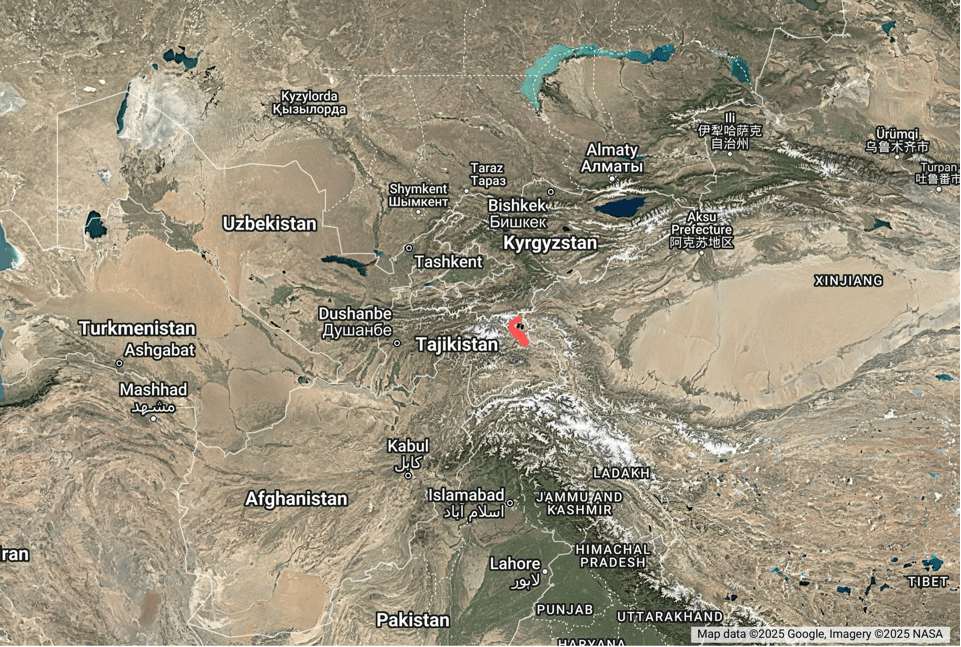 Our route in red showing Tajikistan with Turkmenistan to the west, Kyrgystan to the north, Xinjiang (China) to the east, Afrghanistan to the south