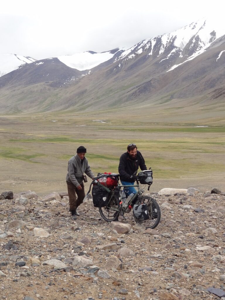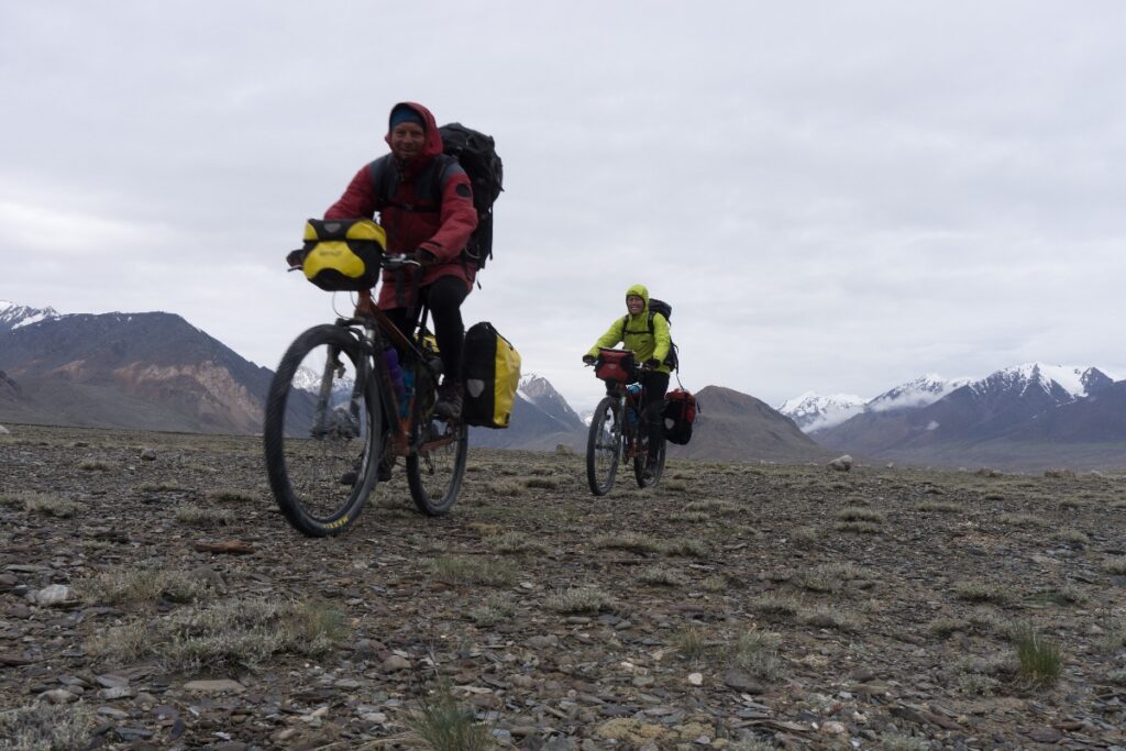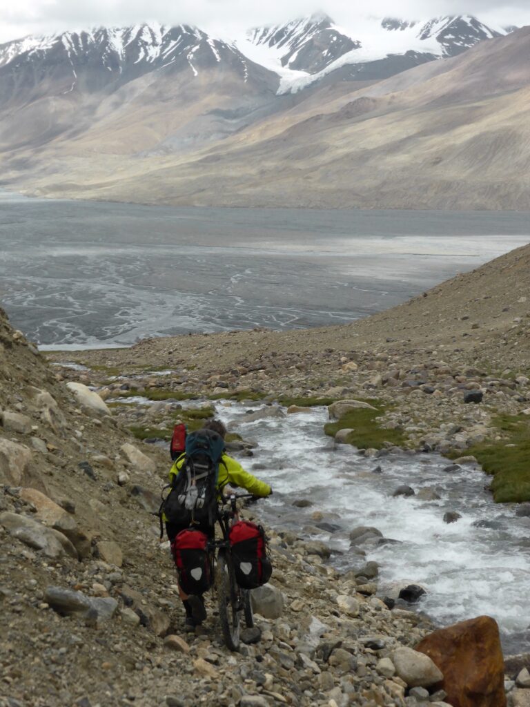 From the pass we look out to a wide floodplain several hundred metres below us. More brown and grey slopes either side of the floodplain taper up into snow capped by clouds. We can’t see the Dankai confluence – no clues yet on how deep the crossing might be. Chris and Michael leap on their bikes and take off down the slope, veering between rounded boulders. I yell, “Do you want to break your bike?”