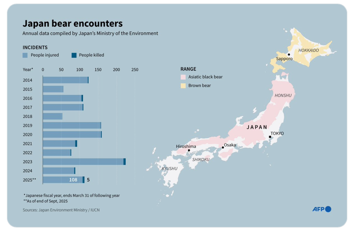 In the last week there were 3 fatal bear attacks – a man having his head torn off while picking mushrooms (a click-bait title if I ever saw one, even if true!), a man found with claw marks on his body, a woman killed in the forest while picking mushrooms (looks like picking mushrooms is a bad idea) and one of her friends is still missing, plus a tourist attacked at a bus stop, a hiker dragged into a forest… Media stories say bear attacks are on the rise in Japan, but this infographic does not seem to support that statement. I also compared deaths from bear attacks in Japan and Canada – Canada (41.5 million) has 1/3 the population of Japan (123 million) and there is generally one death a year from a bear attack in Canada compared with 2-5 in Japan. Maybe we were in Japan for a really bad bear week.