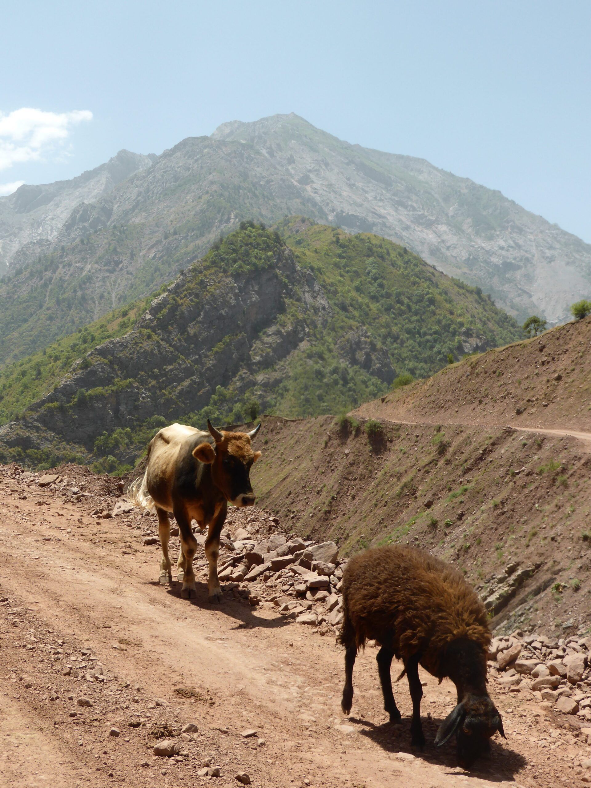A Tajik fat bottomed sheep that is steering a new course with its cow friend