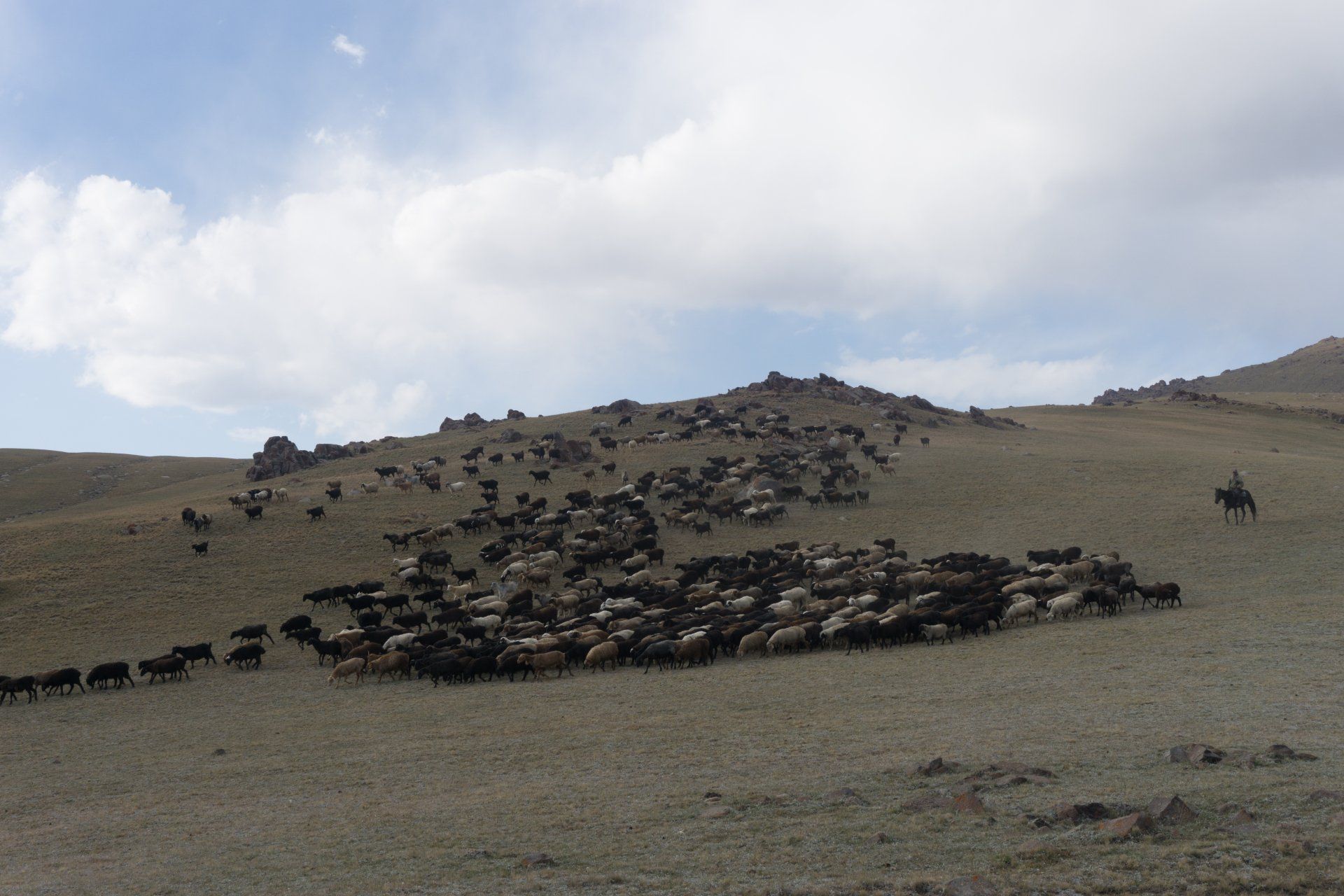 A herd of fat bottomed sheep in Kyrgystan above Song Kul lake. Fat bottomed sheep are native to this part of the world. There is literally a large pad of fat on their rump which wobbles as they walk. There is very little fat in any of the other available food sources so fat bottomed sheep are prized.