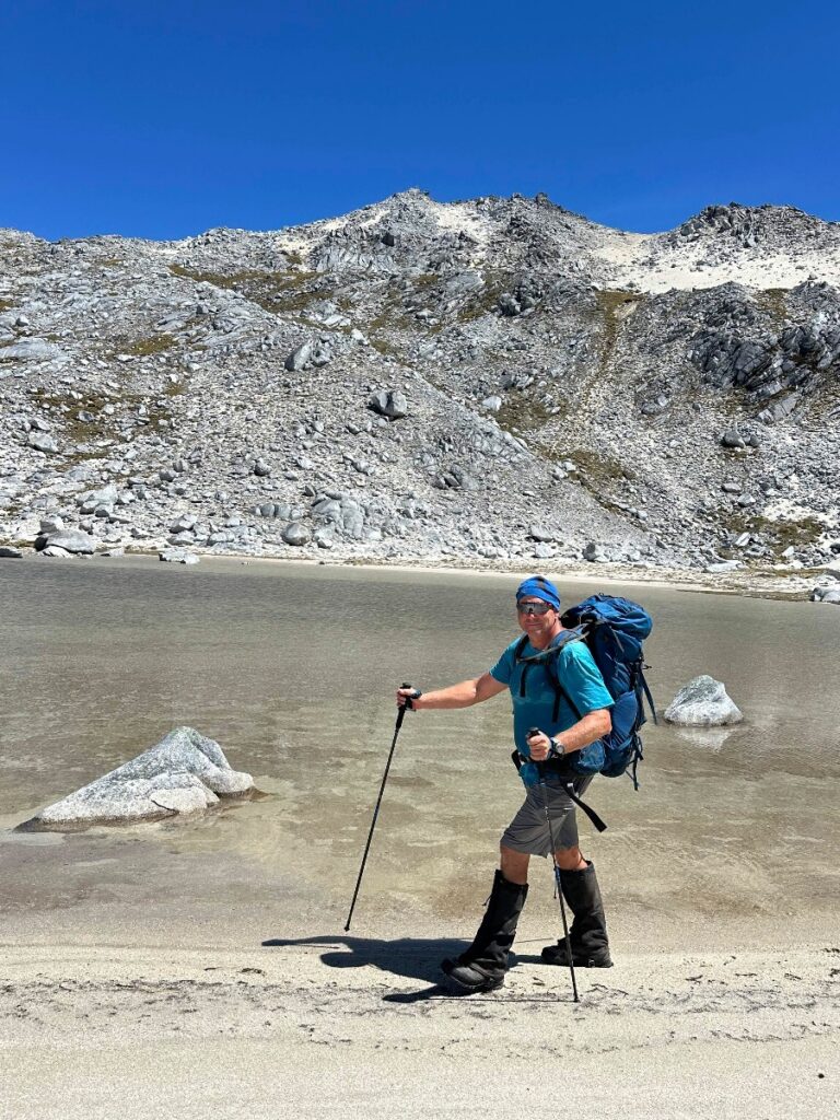 We cross the Garnock Burn wearing sandals, breaking my ‘Don’t take your boots off crossing a river when tramping,’ rule. My excuse is that the river is no more than calf deep, slow flowing and clear. And I don’t want wet socks and boots for the thirteen hundred metre climb on the other side of the river to reach the top of Mount Titiroa.