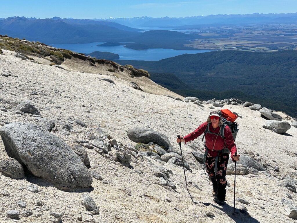We climb the last three hundred metres to the peak at 1715m and views of Lakes Manapouri, Te Anau, Monowai. We can see Tutoko, Pikirakatahi – Mount Earnslaw, Tititea – Mount Aspiring and, we think, Aoraki – Mount Cook.