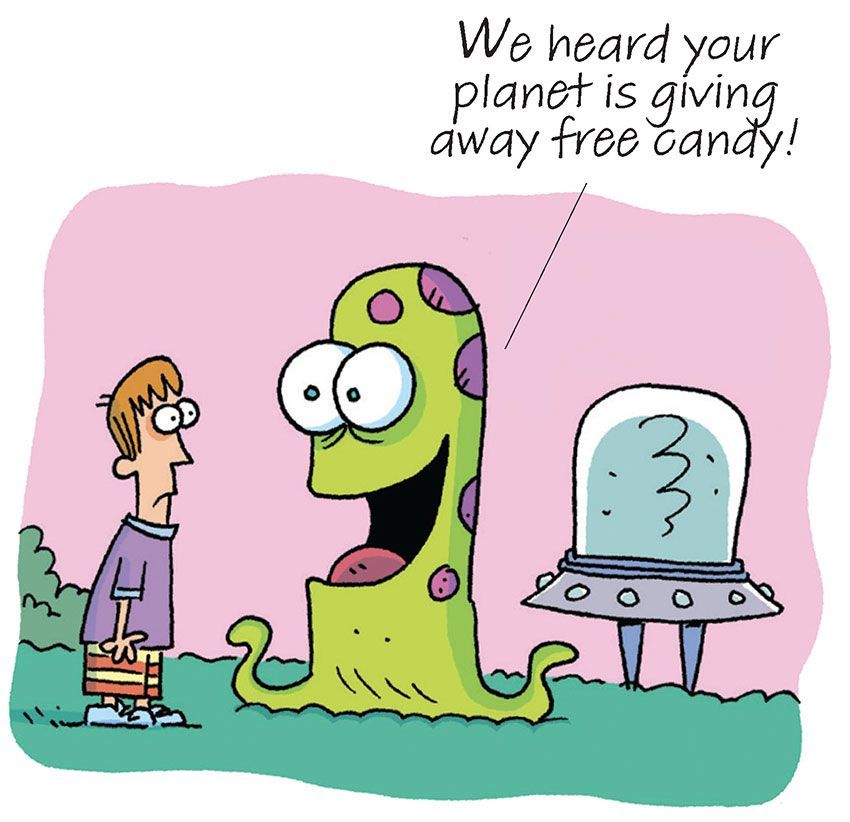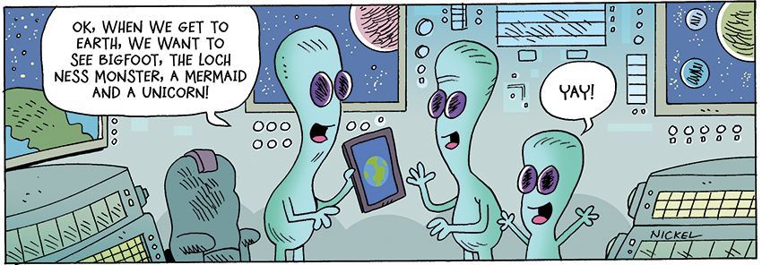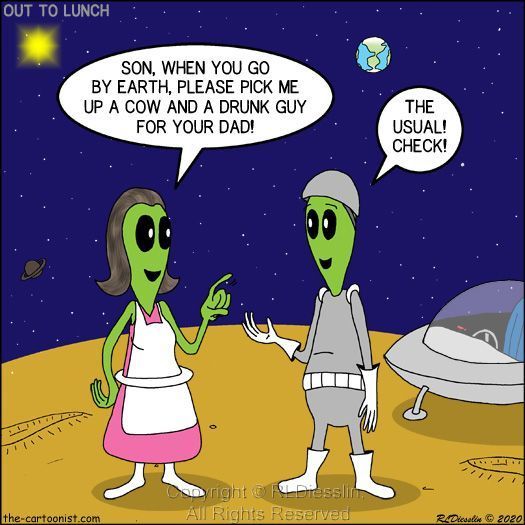 “Your leader?” the lime green alien said. “No mate, we want to go shopping.”