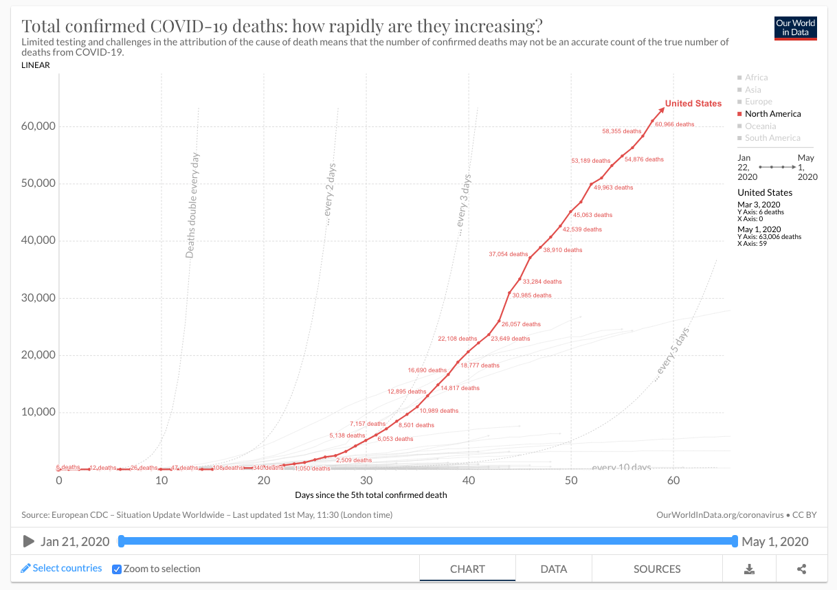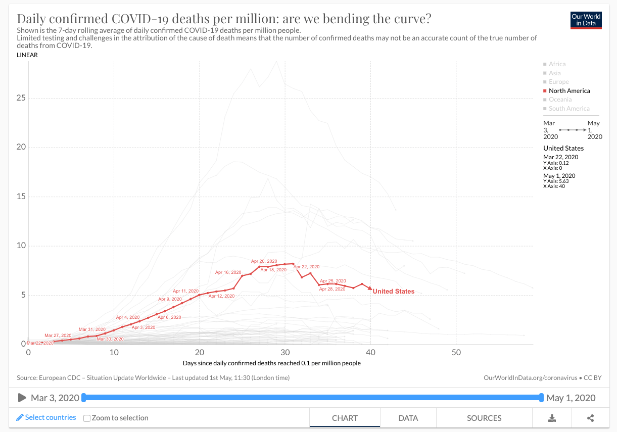 The response in the USA has been patchy – on March 16 Trump announced ’15 Days to Slow the Spread’. In the second half of March, some states ordered businesses to close and people to stay inside, including New York and California, with about 90% of the country’s population being in some form of lockdown by April 2nd. Trump suggested that restrictions could be lifted by Easter (April 12th), but extended this till the end of April on March 29th, when it became obvious that COVID-19 was still on the increase. By late April, the pressure increased to remove economic and personal restrictions and Trump released a three phase advisory plan for states to follow, ‘Opening Up America Again’ and has variably encouraged and discouraged reopening, while emphasising that the economy must continue. He continues to evade criticism that he predicted zero cases by 1 May – I heard one interview in which he countered that ‘There will be zero cases at some point’. To many other countries, the USA reduction of restrictions seems premature given a lack of testing capability at scale, and given the current numbers of cases and deaths. This is another example of experimentation in the COVID-19 pandemic, and an example that might be preferable to watch rather than participate in.