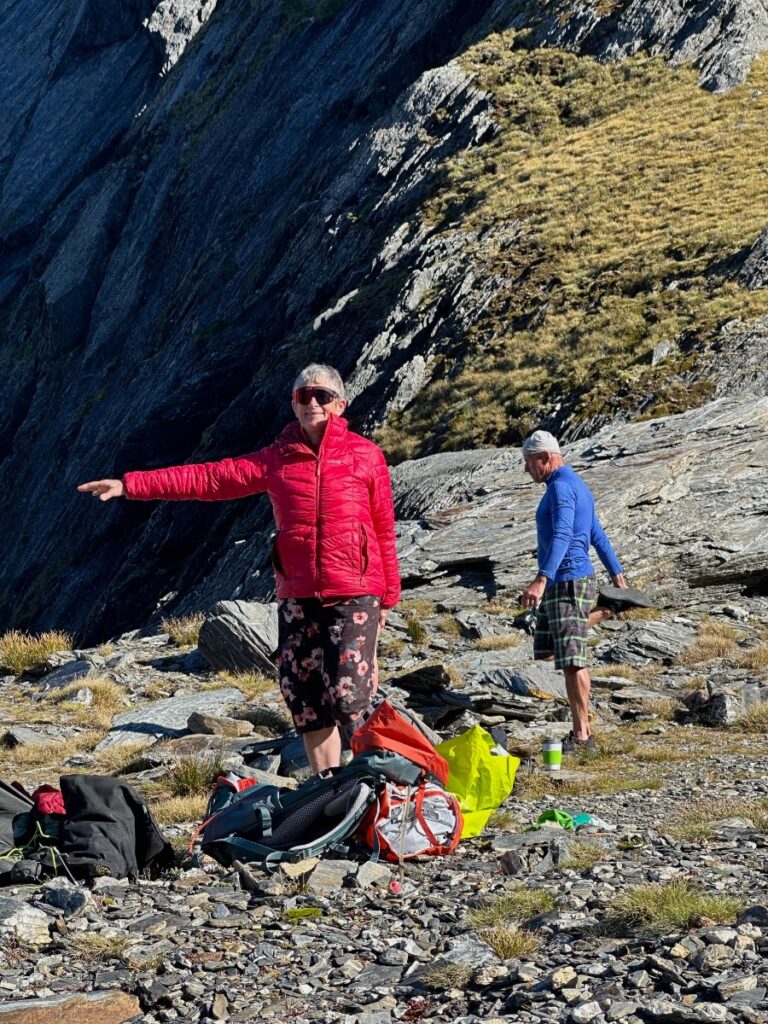 However, what I want to write about today is being grateful to my body – being grateful it got me through two seven hour days of hard walking. Being grateful that my fifty-eight year old body is working well enough to do the teetering and grovelling and navigating through terrain without tracks. My body can climb up Mount Shrimpton to two thousand metres elevation and descend precipitous tussock slopes, scrub you have to force your way through and slide down on your bottom. My body can negotiate slippery roots and rocks without my falling on my face or some other part of my anatomy. Better yet, my body can enjoy the exercise.
